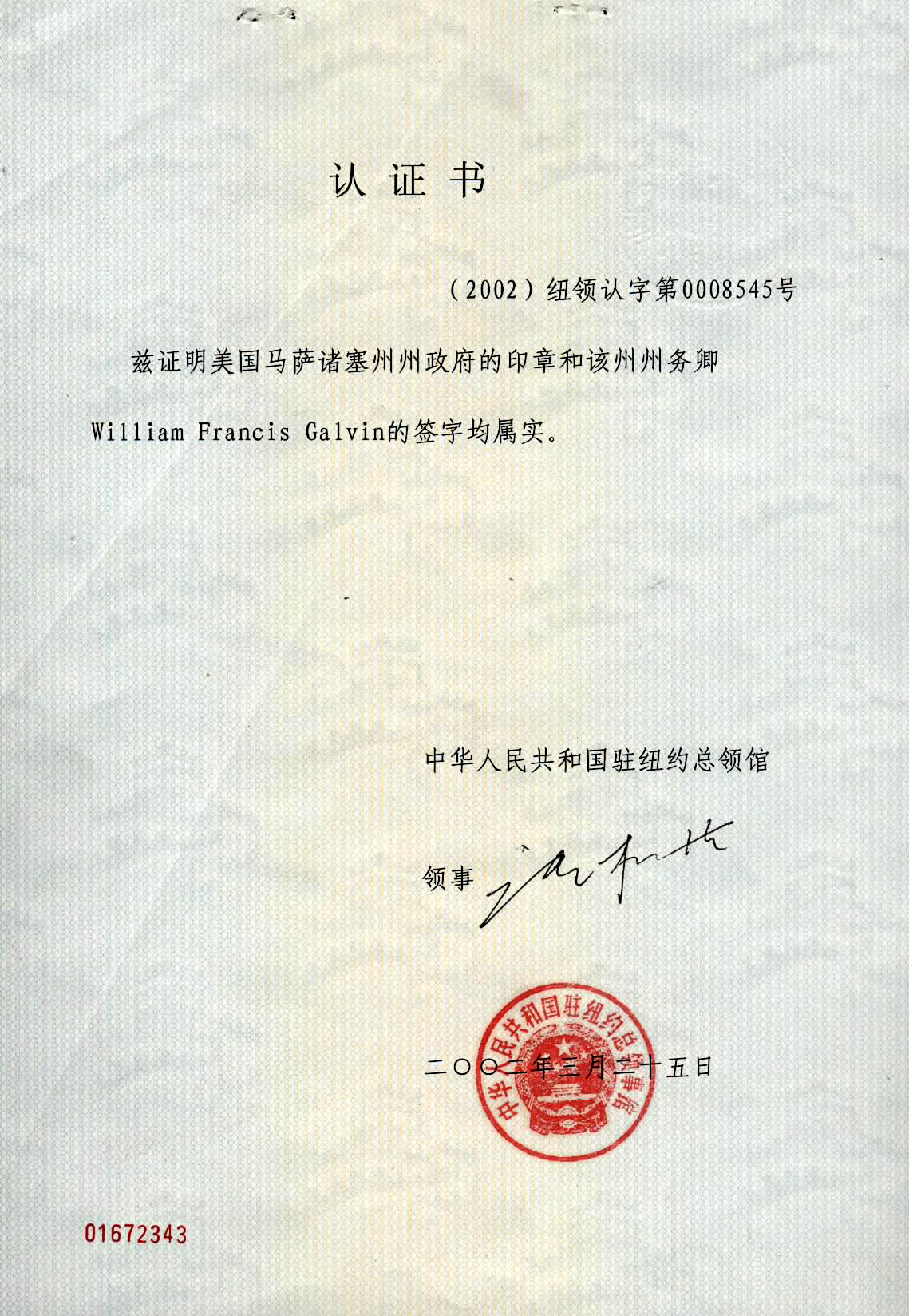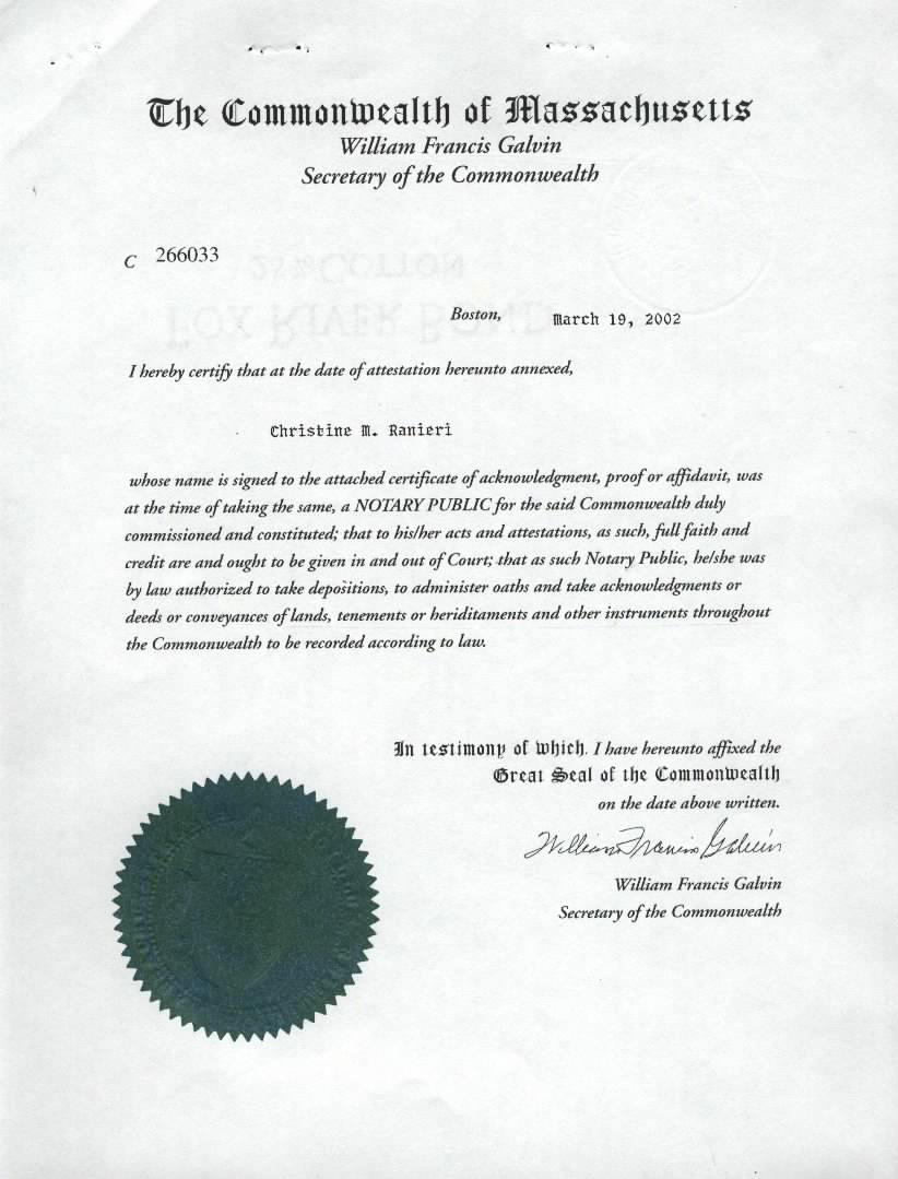 本资料经美国马萨诸塞州州政府和该州州务卿及中华人民共和国驻纽约总领馆盖章签字公证。