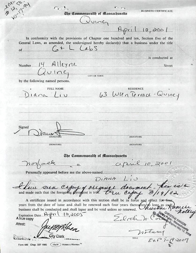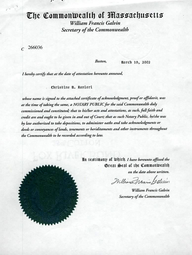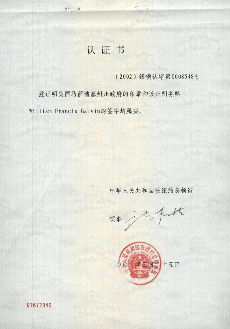 本资料经美国马萨诸塞州州政府和该州州务卿及中华人民共和国驻纽约总领馆盖章签字公证。